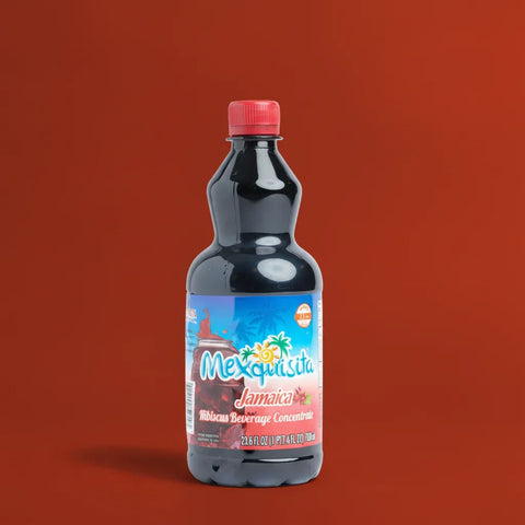 Bottle of Mexiquisita Hibiscus beverage concentrate on a red background