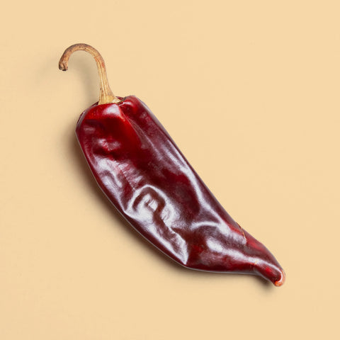 Beige paper bag of Ancho Flakes with a small pile of flakes in front on a red background